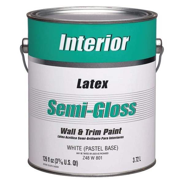 Interior Paint, For Use On Surface Material Brick, Drywall, Masonry, Metal , Plaster, Wood, Paint Base Type Latex, Paint Color Family Whites, Color China White, Finish Semi-Gloss, Size 1 gal, Coverage 400 sq ft/gal, VOC Content Less Than 50g/L, Dry Time Recoat 4 hr, Paint Sub-Brand Economy Line, Paint Cleanup Soap and Water, Dry Time 30 min, Min. Application Temp. 50 Degrees F, Application Method Brush, Roll, Spray