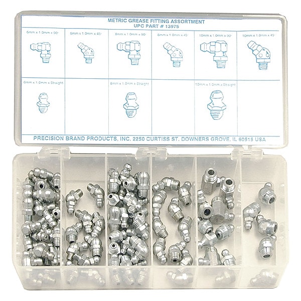 Grease Fitting Kit, Grease Fitting Style Standard, Fitting Material Steel, Dimension Type Metric, Thread Size M10x1, M6x1, M8x1, Thread Type Metric, Number of Pieces 95, Package Quantity 95