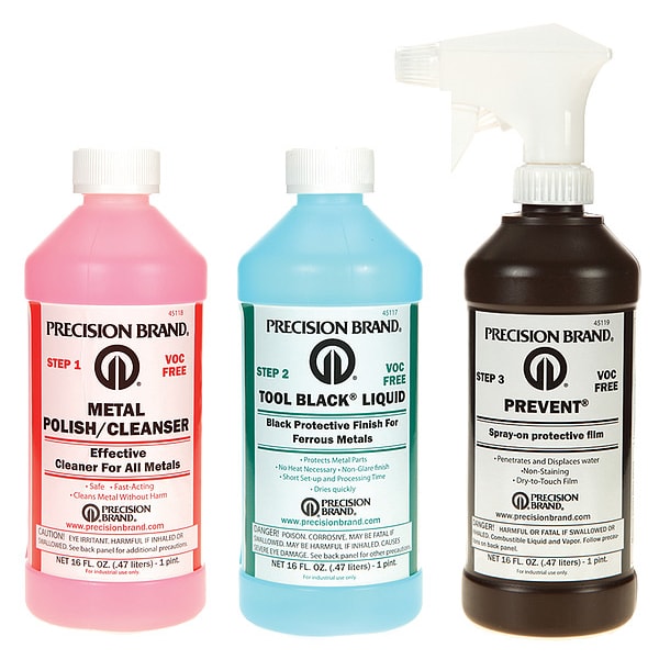 Tool Blackener, Blue, 1 pt, For Workpiece Material Ferrous Metal, Application Method Immersion, Container Type Bottle, Coverage 25 sq ft to 35 sq ft, Features All Components VOC Free, Special Ventilating Not Required;Fast and Inexpensive Alternative to Black Oxide;Liquid is Best for Small Immersible Parts, Function Adds a Dull Protective Finish, Includes 1 pt Each: Tool Black Liquid, Metal Polish/Cleaner, Prevent Sealer and Rust Preventative, Material Liquid, Material Form Liquid