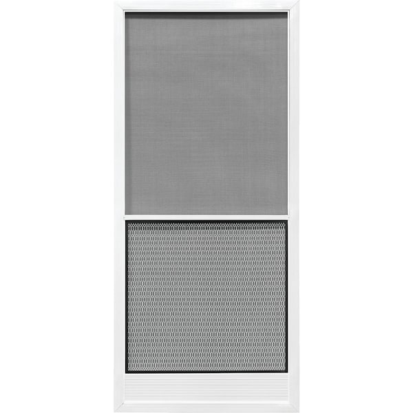 Swinging steel screen door. Features 2 In. x 7/8 In. 0.016 roll form steel frame construction with stamped steel corners to add rigidity. Includes push button handle assembly with drilling jig for easy installation along with a pneumatic closer. Hinge side adjustment and bottom adjustment channel provide an ideal fit. Single horizontal push bar and standard 5-1/4-inch kick plate. Charcoal fiberglass screen and standard mesh pet grill on bottom section. Includes Precision Safeguard packaging and mounting hardware. Reversible for left or right hand operation.