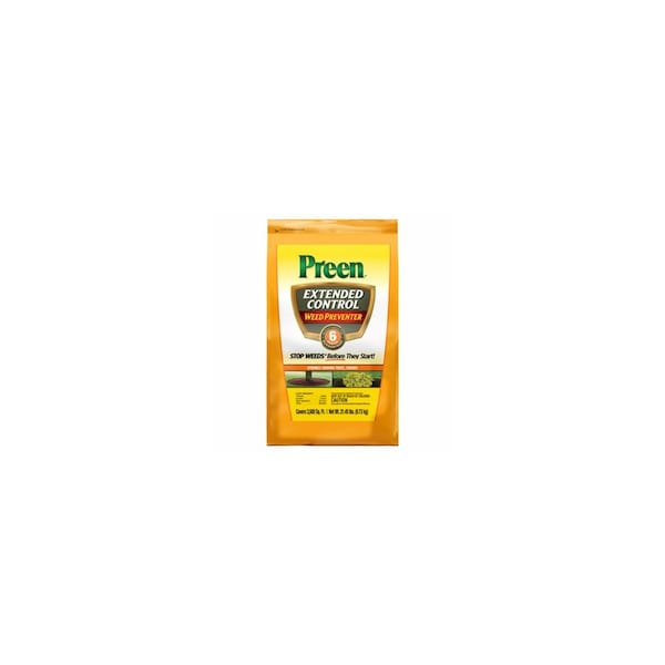 WEED PREVENTR EXT CTRL 21.45LB Specifications: Compositions: Trifluralin Isoxaben Mineral Seal Oil Corn Cobs For 50 years, gardeners have trusted Preen weed preventer products to help keep their garden and landscape beds weed-free for months. Preen extended control weed preventer is the longest lasting Preen yet, stopping weeds for up to six months per application. It's labelled for use around 600 plants in perennial flower beds around groundcovers, trees and shrubs and in xeriscape settings and rock gardens. Preen extended control weed preventer tackles many of the toughest weeds a gardener faces, including dandelions, crabgrass, field bindweed, white clover, chickweed, henbit, purslane, Carolina geranium, stinging nettle, horseweed or marestail, oxalis, spurge, lambs quarters and more. Preen's jug-handled bottle with a flip-top applicator cap makes Preen extended control weed preventer easy-to-apply. Simply flip open the top, tilt the bottle and start shaking it to evenly distribute the product granules on top of soil or mulch. Water in the treated area to activate the protective weed barrier. That's all it takes to stop listed grassy and broadleaf weeds for up to six months.