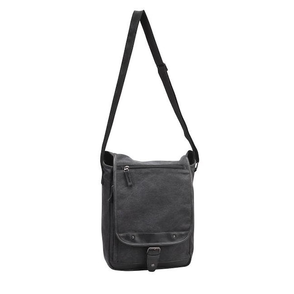 Beautifully constructed with 12 oz. stonewashed canvas, highlighted with rich,faux leather trim and fully lined, this eye-catching sling bag is stylish & practical.Its secured by a brass tuck lock system that compliments the design ofthe bag. Beneath the flap, theres a vertical iPad tablet pocket thats fully paddedto protect your device. Inside the main compartment, youll find plenty ofpockets for cards, pens, and notes, as well as a zip pocket for other importantitems. Finished with an adjustable shoulder strap