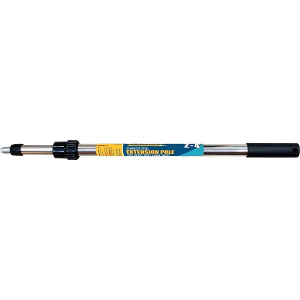 Pro heavy-duty stainless steel external twist lock telescoping extension pole with threaded metal tip. Large external lock mechanism for ease of extension.