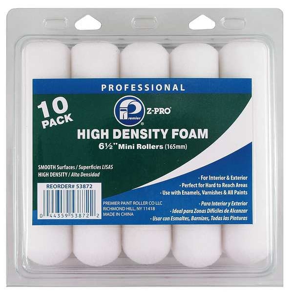 Mini Paint Roller, Cover Type Standard, Surface Texture Smooth, Compatible Roller Frame Style Wire, 6 1/2 in Overall Length, 0 in Nap Size, Paint Type All Paints, Enamels, Stains, Urethanes, Varnishes, Core Diameter 5/8 in, Cover Material Foam, Core Material Plastic, Package Quantity 10