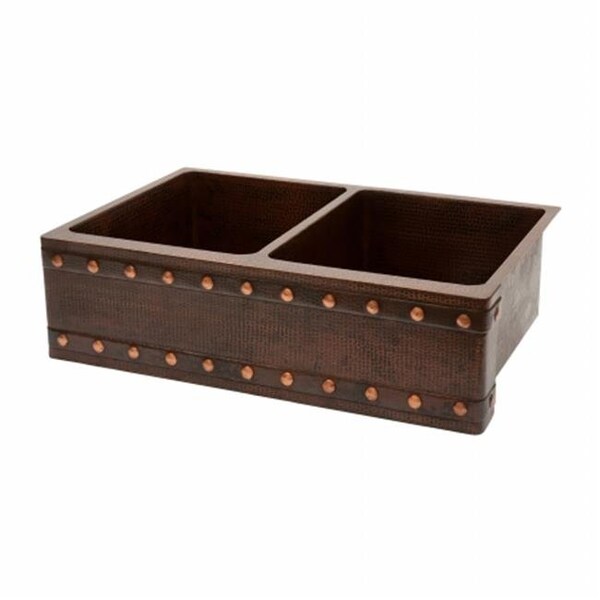 33 in. Hammered Copper Kitchen Barrel Strap Apron 50/50 Double Basin Sink