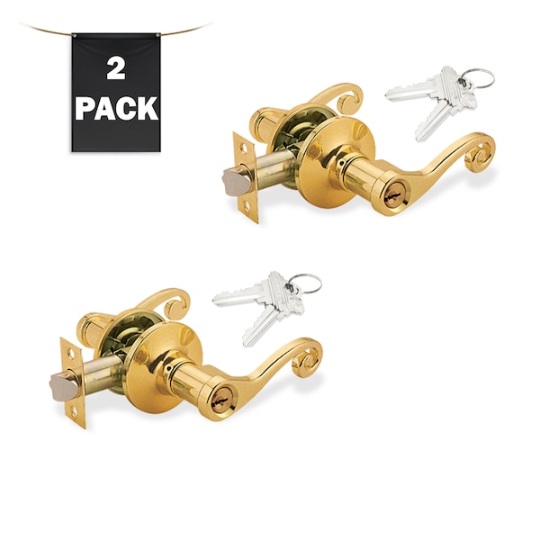 Decorative Entry Door Lever Lock Set Set of 2, Keyed Alike, Polished Brass, 2PK