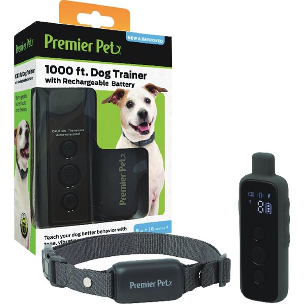 Introducing the Premier Pet 1000 Foot Trainer a reliable solution to help you effectively correct unwanted behaviors in dogs of all sizes. This advanced training tool ensures clear communication and consistent enforcement of rules in a way that your dog can easily understand. With a user-friendly remote featuring an LCD display you can tailor the training experience to your dogs specific needs with three safe modes: tone vibration and 16 levels of static stimulation. The rechargeable waterproof collar includes an adjustable nylon strap accommodating dogs with neck sizes up to 28 inches. Its durable and versatile design is perfect for off-leash walks around the park or long hikes with your dog. The low battery indicator and quick 2-hour recharge ensure your training sessions are never interrupted. Expandable to train up to two dogs with the purchase of an Add-A-Dog Collar.