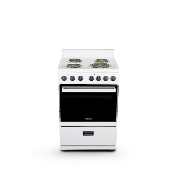 PREMIUM's 24 in. 2.7 cu. ft. Electric Range in white with black accents is the perfect appliance for your apartment, condo, cabin, cottage or office kitchen and anywhere space is of concern. The stylish fresh white finish livens up any kitchen and matches any decor. Just as in larger units there is an in-door window and oven light to allow users to check on food while it is cooking. Two adjustable wire racks, a broiler tray and grid are included. A handy removable storage drawer is perfect for storing your flat cookware, such as cookie sheets and cupcake pans. By removing the drawer you can quickly and easily clean around and under the oven. With its small footprint, it conserves space while providing all the functionality you need to cook healthy meals at home.