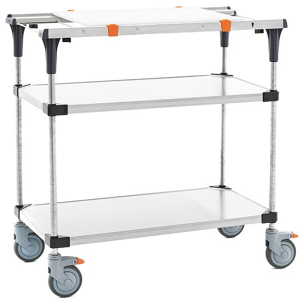 Portable Prep/Work Table, Number of Casters 4, Number of Shelves 2, Adjustable Height Yes, Capacity 800 lb, Caster Type (4) Swivel w/Brake, Color Silver, Includes Shelves with Stainless Steel Post, Material Stainless Steel, Overall Height 39 1/4 in, Overall Length 38 in, Overall Width 19 1/2 in