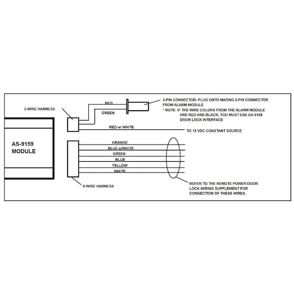 This module is designed to interface with any Remote Security System with Ground Pulsed door lock outputs. When interfacing to AUDIOVOX SECURITY Products, verify that the 2-wire door lock output connector from the alarm module is loaded with a Red and a Green wire.NOTE: If the 2-pin door lock output connector from the Alarm Module is loaded with a Red and Black wire, you must use the model AA-9158Door Lock Interface.2. This module will require the addition of the optional ''PDA-1'' Kit in these types of Power Door Locking Systems.a. Vacuum operated power door locks.b. Door locking systems requiring key locking of drivers door in order to automatically lock all other doors