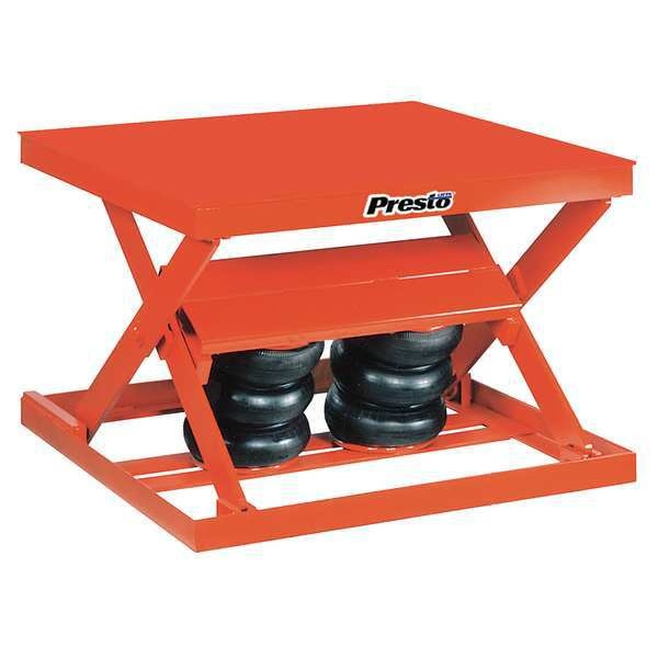 Scissor Lift Table, Platform Length 48 in, Platform Width 48 in, Maximum Load Capacity 2,000 lb, Minimum Lifting Height 8 in, Maximum Lifting Height 32 in, Lift Control Hand Lever, Lift Mechanism Pneumatic, Lift Table Platform Style Fixed, Overall Length 48 in, Overall Width 36 in, Overall Height 8 in, Frame Material Steel, Includes Hand Control and Pressure Relief Valve, Number of Lifting Posts 0