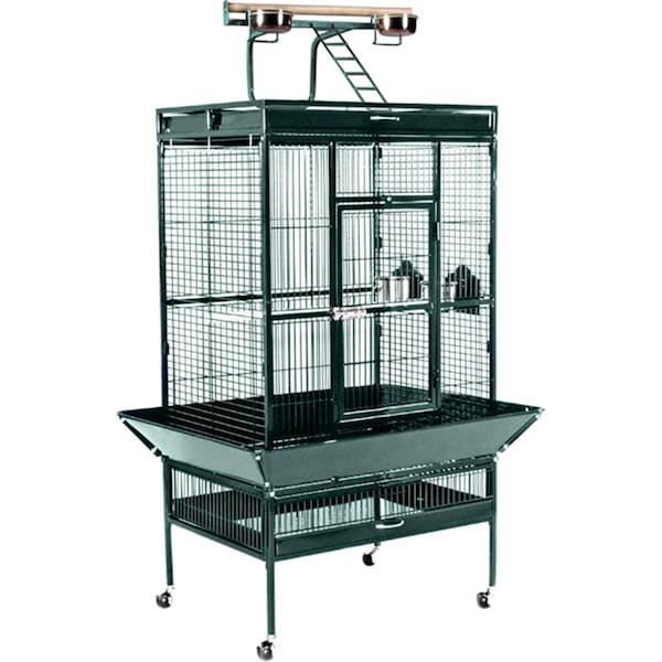 Wrought Iron Select Cage in Sage offers quality craftsmanship at an affordable cost.Constructed of wrought iron with a cagetop playstand to keep your bird entertained and content a heavy-duty push button lock keeps your bird securely inside the cage when playtime is over.This select bird cage also includes four stainless steel cups two wood perches and a castered stand for portability.Both drawers and bottom grille are removable for ease of cleaning while the rounded corner seed guards control mess around the cage.-Available in black cobalt blue chalk white coco jade green garnet red sage green and pewter.-Includes top and bottom pull out drawers and bottom pull out grille 4 stainless steel cups top playpen and rounded seed guards and cage stand with easy-rolling casters.-The heavy duty push-button door lock ensures your pet s safety.-Measures: 30in L x 22in D x 63in H.-0.75in Wire spacing.