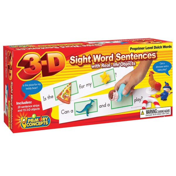 Even though a child masters sound/symbol relationships, reading fluency may be difficult without instant recall of the 220 high-frequency Dolch sight words. With 3-D Sight Word Sentences, kids master sight words as they create hundreds of fun, fanciful sentences with nouns that literally "jump off the page". Just trade objects and a wacky new sentence springs to life! Each set includes 15 real-life miniature objects, 20 sentence cards, and teaching suggestions.