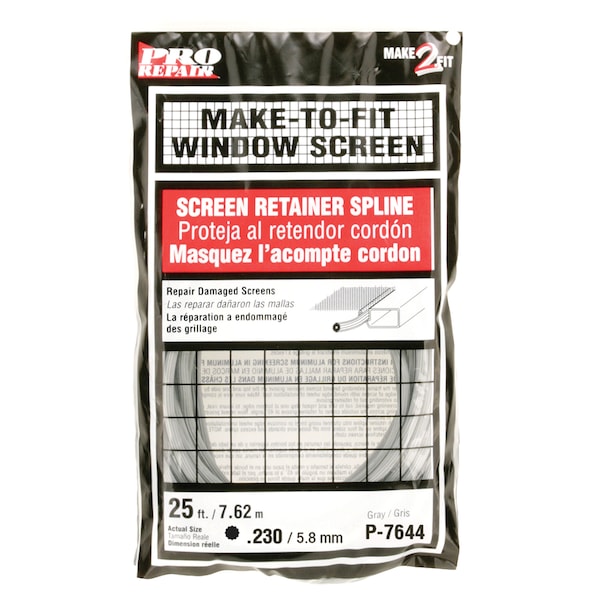 This is a screen retainer spline designed to be use for securing various types of screen fabric into a window screen or screen door frame. 0.230 in. (15/64 in.) in diameter. It is a top quality round, serrated vinyl with a hollow core. Color is gray. 25 ft. per roll.Used for securing various screen types into window screen channels UV stabilized 0.230 in. diameter Gray vinyl construction 25 ft. roll Hollow core for easy installation 32 point serrated design For further dimensional information, please see the line drawing