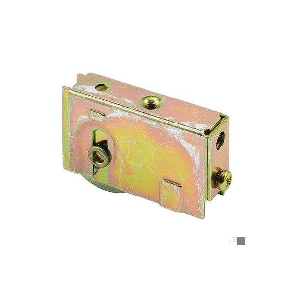 This is a plain back patio door roller assembly with a 1-1/2 inch concave steel ball bearing roller. It has a plain back housing that is 11/16 inch wide and 1-1/2 inch tall with a flare width of 13/16 inch and features a rear adjusting with a 1/4-20 threaded mounting hole on the back end. A #10-32 threaded optional use hole on the top. It is used by a variety of manufacturers of patio doors.