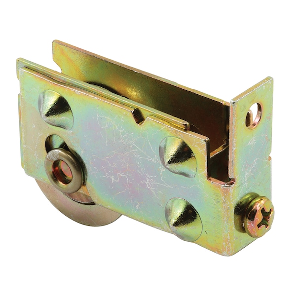 This is a E-tab patio door roller assembly with a 1-1/8 in. concave steel ball bearing roller. As the corner screw passes through the E-tab it captures the roller assembly and positions it in the door's bottom rail. The housing is 19/32 in. wide with 7/8 in. dimples, 1 in. tall and 2-1/8 in. long. It features a rear adjusting screw. Used by Viking and a variety of other sliding patio door manufacturers.Used by Viking doors and a variety of other sliding patio door manufacturers Used on metal framed sliding patio doors 1-1/8 in. concave ball bearing roller Stamped steel housing and roller E-tab housing Rear adjusting screw A Phillips head screwdriver is required for installation For further dimensional information, please see the line drawing
