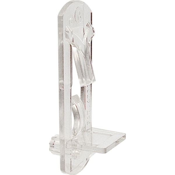 These shelf pegs are constructed of plastic and come in a clear finish for increased concealment. They are designed to receive 1/2 in. thick shelves and can support a maximum of 5 lbs. each, per peg. The main feature of these shelf pegs is the self-locking tabs that secure the 1/2 in. thick shelves in place, preventing tipping and rotating of shelves. The 1/4 in. outside diameter pegs have a 5/16 in. depth and feature serrated stems for a stronger grip. See Prime-Line parts U-9395 for 5/8 in. thick shelves, U-9397 for 3/8 in. thick shelves (w/5mm outside diameter peg) and U-9398 for 3/4 in. thick shelves. * Adjustment Tip: To remove and relocate these support pegs, the tabs which lock in the shelves must be pushed in and held in while twisting the shelf upward in a clockwise direction if lifting the shelf from the left side. If shelf will be lifted upward starting from the right side, push and hold in the locking tabs of the support pegs (on the right) while twisting the shelf upward in a counter-clockwise direction from the right side. To accomplish this task a third or fourth hand may be required. Another option would be to slide in a couple of old credit cards or business cards in between the shelf's edge and the locking tab of the support pegs. This may assist causing the locking tabs to be pressed in by the cards when pushing up on one side of the shelf. Make sure the cards to be used are no longer needed as it is possible they will scratch and no longer be useful. Once the shelf is removed from its supports, the supports can be pulled out from the cabinet and relocated to desired height.Used to lock 1/2 in. shelving into place 1/4 in. outside diameter serrated peg that is 5/16 in deep. Maximum load of 5 lbs. per peg Clear plastic construction Contains 6 locking shelf pegs Locking design secures shelf in place No tools required For further dimensional information, please see the line drawing