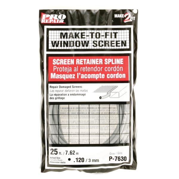 This is a screen retainer spline designed to be use for securing various types of screen fabric into a window screen or screen door frame. 0.120 in. (1/8 in.) diameter. It is a top quality round, serrated vinyl with a hollow core. Gray in color. 10 ft. per roll.Used for securing various screen types into window screen channels UV stabilized 0.185 in. diameter Gray extruded vinyl 10 ft. roll Hollow core for easy installation 32 point serrated design For further dimensional information, please see the line drawing
