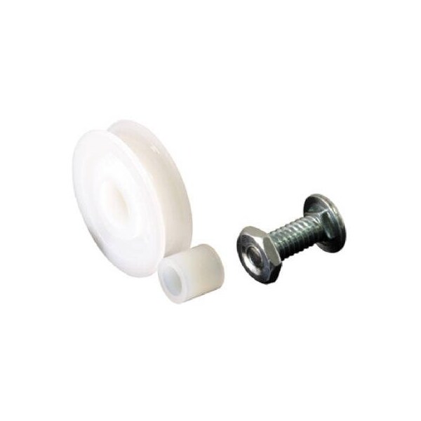 Center grooved nylon wheel features a nylon bushing and aluminum axle Used on bottom mount installations Comes complete with necessary hardware and is easy to install
