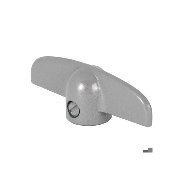 This is a is a diecast T-handle that universally fits a variety of manufacturer's casement operators. The 3/8 inch bore fits most operators with a 3/8 inch spindle and held firmly in place with the supplied set screw. This T- handle is aluminum in color, and the design is often used to replace the normal crank handle when it interferes with window blinds.