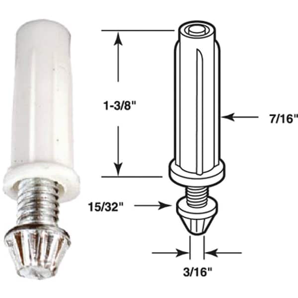 The 3/8 inch diameter nylon base houses a grooved pivot tip that screws in or out for adjustment. 1-3/8 In. L. x 15/32 in. O.D. bottom pivot bolt for bi-fold doors. Adjustable steel pivot with nylon base. 2 per card.