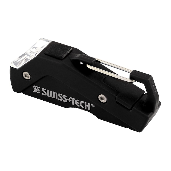 The SWISS+TECH All-Purpose Modular Tool System includes: LED flashlight, knife, a Phillips driver, flathead driver, bottle opener and quick release clip. Quick clip keeps the tool handy wherever you go. Push-button LED flashlight with replicable batteries included. This item comes with the black color housing. Covered by SWISS+TECH' s limited lifetime warranty.