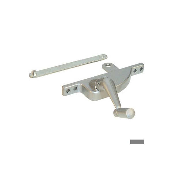 This is a jalousie operator in an aluminum finish and a diecast construction with an offset crank handle. It is a left-handed design with a 4 inch link arm(center to center), and it comes with a matching aluminum finish crank handle that securely fits the 5/16 inch spindle. There are two mounting holes, 4-3/4 inch or 3-7/8 inch on center for a more versatile fit.