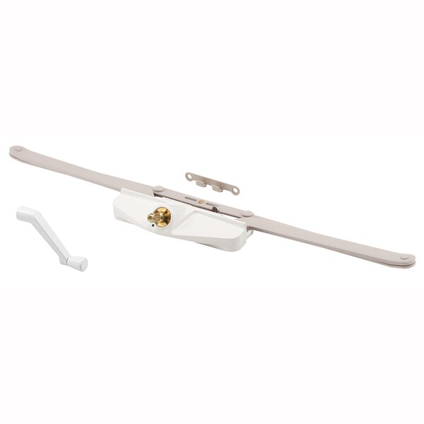 These awning operators are constructed of high pressure diecast zinc and the case and crank come in a white-colored baked enamel finish. Each operator features a simple detach clip which allows the operator to disengage from the sash's center hook for quick and easy window release. This awning operator mounts on the bottom window sill of crank out awning windows, and holds the sash open at the user's desired location. These operators replace others whose roto gears may have become worn and stripped, or the spline to which the hand cranks attach. Included with each is the operator, a crank, a sash hook and installation fasteners.