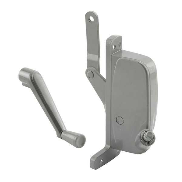 This is an awning operator of aluminum diecast construction with a gray baked enamel finish used on Pan-American Windows. It is right-handed with a matching crank handle with a 2-5/8 inch link arm. It has an L-shaped mounting hole pattern that has two top holes that are 5-1/4 inch from center of the top holes to the center of the bottom hole and the two horizontal holes in the bottom leg are 1-5/16 inch on center.