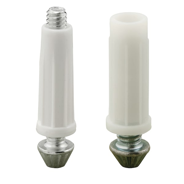 These bi-fold door bottom pivots are constructed of plastic bases and steel pivot screws. This kit includes a pair of 3/8 in. diameter bases and a pair of 7/16 in. diameter bases. These height-adjustable bases install beneath the pivoting vertical style of bi-fold doors and lock into pivot brackets that fasten to the jamb and/or floor. Each pivot screw head features a grooved cone-shaped pivot head, and it screws in or out of the plastic base for adjustment. These pivots are easy to install and they are used by a variety of bi-fold door manufacturers.Used to replace missing or damaged hardware of bi-fold closet door systems This kit includes a choice of two pairs of bottom pivots, one with 3/8 in. diameter and the other with 7/16 in. diameter The adjustable steel pivot screws feature grooved cone-shaped pivot heads that fit into jamb or floor-mounted brackets (not included) Bases are constructed of plastic and come in a white finish Bottom brackets compatible with these pivots include the following: Prime-Line parts N 6697 and N 6674 These bottom pivots have a screw in/out door height adjustment feature 2 Pack For further dimensional information, please see the line drawing