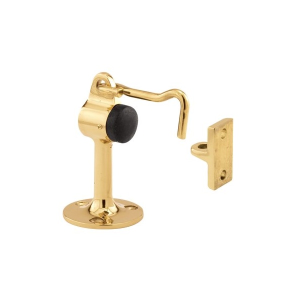 This is a hook mounted door stop. The hook engages the hook holder on the back side of the door to hold it open. It is solid brass with a polished brass finish and a rubber bumper that mounts to the floor. It has 3 mounting holes and comes with screws and a lag bolt for mounting.