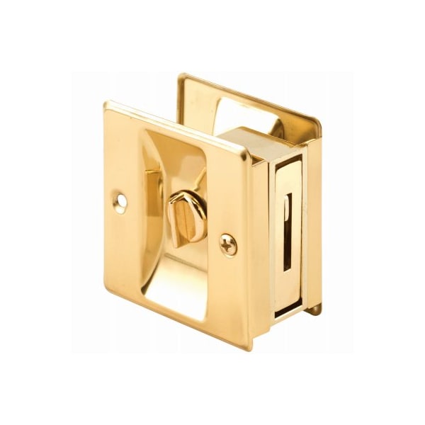 Solid brass privacy lock and pull for a pocket door Fits doors that are 138 to 134 thick It is 234 tall and can be reversed from lefthanded to righthanded Carded