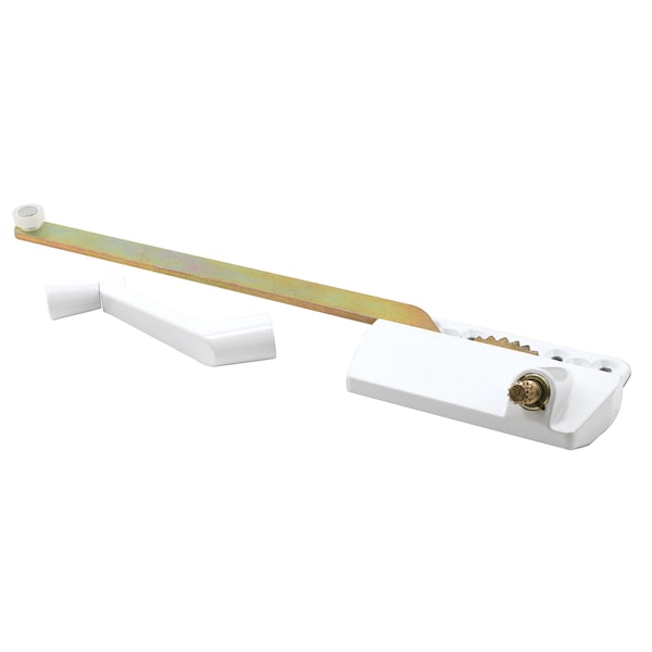 This Prime-Line H 3864 Left-Hand Casement Operator features a guide button that easily glides through the track. This casement window handle is used by a variety of wood and vinyl window manufacturers. Designed for left-handed casement windows. It is right-handed as viewed from the inside looking out. The body of the window handle crank is constructed of white diecast, with a steel arm and worm gear. The arm of the casement window crank handle replacement measures 9-1/2 inch from the middle of the guide button to the middle of the crank operator while closed. For further dimensional information, please see the line drawing (not universal).