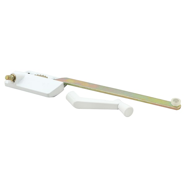 This Prime-Line H 3863 Right-Hand Casement Operator features a guide button that easily glides through the track. This casement window handle is used by a variety of wood and vinyl window manufacturers. Designed for right-handed casement windows. It is right-handed as viewed from the inside looking out. The body of the window handle crank is constructed of white diecast, with a steel arm and worm gear. The arm of the casement window crank handle replacement measures 9-1/2 inch from the middle of the guide button to the middle of the crank operator while closed. For further dimensional information, please see the line drawing (not universal).