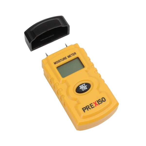 This PREXISO moisture meter is designed for measuring moisture content in drywall, sheetrock and plaster walls, in addition to sawn lumber (paper and cardboard too), and materials that harden - like mortar and concrete. It displays the level of moisture content as soon as the metal prongs contact the material to be inspected. This makes it convenient for homeowners and professionals alike to check the moisture levels of their walls and projects, and can also measure ambient temperature. Being portable and easy to carry makes for a great addition to any toolbox. Use the two stainless steel pins by placing them into the surface of what you are measuring in order to capture a reading, but exercise caution, as the pins are sharp. If the unit is idle for more than 15 seconds it will turn itself off with its automatic shut off feature to save the battery life. To protect the pins from damage this moisture meter features a protective cover. Order yours today and inspect for moisture tomorrow.For use in checking humidity, moisture content and ambient temperature in various materials For use with plaster type walls, to include drywall/sheetrock, brick, block, lumber and plywood, in addition to hardening materials such as mortar, concrete, fillers and more Provides moisture content measurement to help prevent or detect growth of harmful mold in dwelling places, offices, classrooms and more Use to inspect walls, ceilings, cabinetry and finished flooring with simple single-button operation Compact and easy to use, and turns off automatically after 15 seconds at idle and this meter uses four LR44 button cell batteries