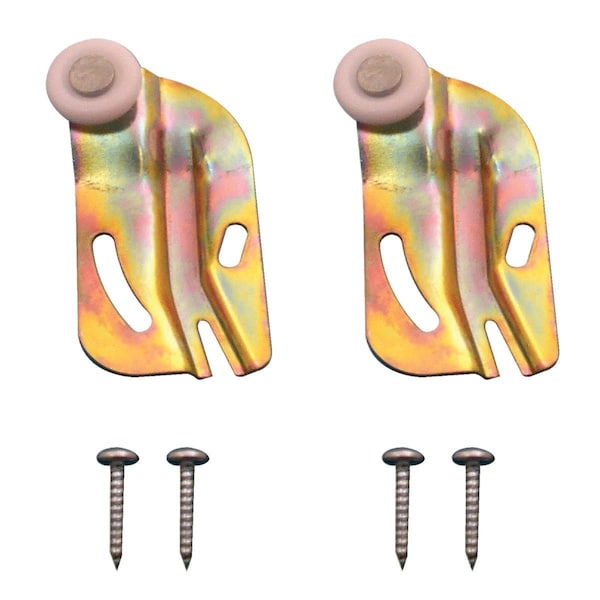 Single wheel top hung side mounting offset adjustable steel bracket for bypass doors. 3/4 In. convex nylon wheel. Hardware is included. 1 pair per card.
