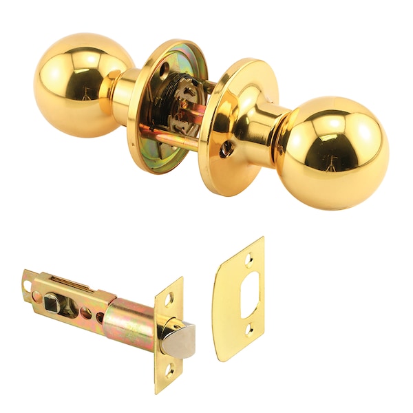 Non-locking passage knobs, Brass-plated finish, Adjustable to fit 2-3/8 inch and 2-3/4 inch backsets, Residential grade III security rating,Ball shaped knobs.
