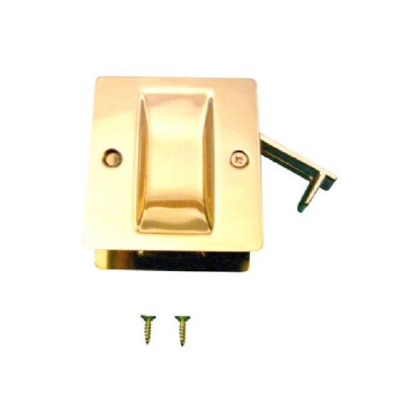 Solid brass pocket door pull with a polished brass finish It fits doors that are 138 in to 134 in thick There is a hidden finger pull on the front edge of the pocket door pull Fasteners included