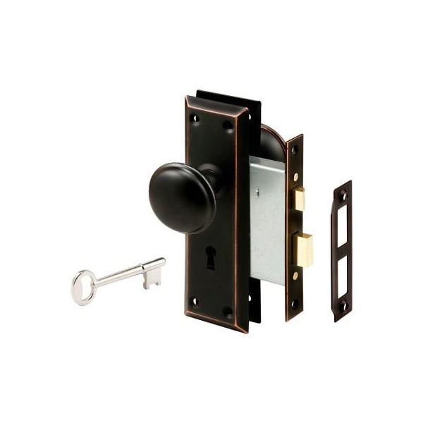 Prime-line classic bronze victorian style keyed mortise entry lock set, e 2495. classic bronze plated knobs and trim plates. Steel case. Lock bolt is key activated from both inside and outside. 2-3/8" backset. Interior use only. Includes one mortise case lock assembly, two knobs, two 2-1/4"w x 7"h trim plates, one strike plate and installation screws.