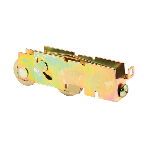 This is a F-tab tandem roller assembly with two 1-1/8 in. concave steel ball bearing rollers installed. When the corner screw passes through the F-tab, the assembly is captured by the side stile and bottom rail as the screw draws the two sides together. The adjustable stamped steel housing is 11/16 in. wide with a 13/16 in. flare, 1-1/8 in. tall and 3-1/8 in. long. Used by a variety of sliding patio door manufacturers.