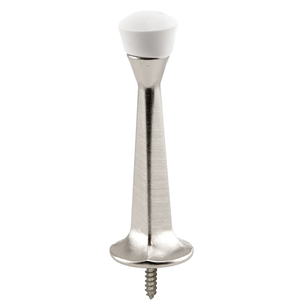 These heavy-duty door stops are constructed of diecast and come in a satin nickel plated finish. They feature a rigid shaft construction with a 3 in. reach, and a white rubber tip to cushion and prevent unwanted damages to nearby walls. These rigid door stops mount over the baseboard with a wood screw insert affixed to the base of the stop. Door stops like these are easy to install and used by many.Used to prevent door handle of opening doors from hitting and damaging adjacent wall 3 in. reach Satin nickel finish Rigid diecast construction with rubber tip These door stops feature an installation fastener affixed behind the base of the stop Includes steel screw insert affixed to bottom Easy to install at bottom of walls over baseboard
