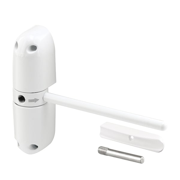 Convert your hinged door into a self-closing door with Prime-Line part KC11US safety spring door closer. This surface mounted door closer installs in minutes! Use this spring door closer on doors that weigh up to 150 lbs. These closers are not handed, so they can be used on both left and right-handed hinged-swinging doors. The door closers feature an adjustable closing force and speed. Constructed of diecast materials with a white painted finish, this safety spring door closer can complement any style door. Each closer is U.L. listed with a 1/2 hour fire rating. These closers operate in a pushing-closed manner, rather than in a pulling-closed method, and they do not have a hold open feature. Distance of travel: The closer arm of this safety spring closer has the ability to swing a full 180 degrees, but once it is mounted in place, the door’s distance of swing will be reduced to the point of where it makes contact with the bullet-shaped housing of the closer. All fasteners and installation instructions are included with this item. For lubrication, avoid using WD-40 which actually breaks down lubricating grease. Instead, apply white lithium grease to internal compressing springs if desired or necessary. Other colors/finishes include: Black, brown, chrome plated and satin chrome plated. For a rust and weather resistant closure, consider model numbers KC50HD (white) and KC57US (brown) which are suitable for outdoor/exterior use, designed for use with lightweight gates and screen doors. Do not overtighten, turning past 4 hole positions will cause this item to fail.