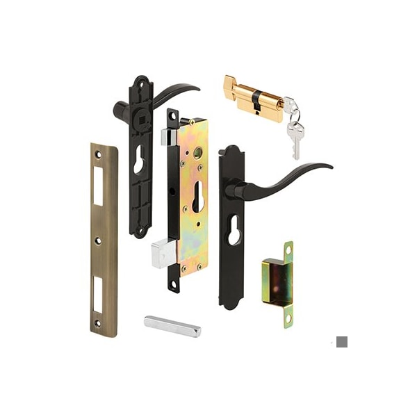 This has appealing contemporary designed lever handles in a black finish with a keyed mortise lock. It is used on security screen or storm doors. The levers are black diecast with a contemporary design. Key cylinder is a double cylinder with a Kwikset keyway.
