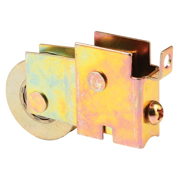 This is a n F-tab patio door roller assembly with a 1-1/2 inch concave or grooved steel ball bearing roller. When the corner screw passes through the F-tab the assembly is captured by the side stile and bottom rail as the screw draws the two sides together. The housing is 11/16 inch wide and 1-5/8 inch tall with a rear adjusting screw. Used by Doormaster, Starlite and a variety of other patio door manufacturers.