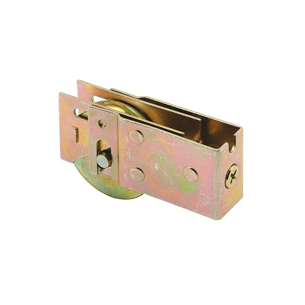 This is a U-back patio door roller assembly with a 1-1/2 inch concave or grooved steel ball bearing roller in a stamped steel U-back style housing. When installed the U-back housing is drawn tightly into position against the side stile as the mounting screw or bolt is tightened. The housing is 3/4 inch wide with a dimple width of 0.760 inch (3/4 inch), 1-5/32 inch tall with a rear adjusting screw. Used by Lausell Aluminum and a variety of other patio door manufacturers.