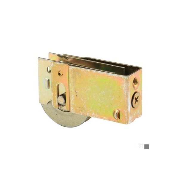 This is a plain back patio door roller assembly with a 1-1/2 inch concave or grooved steel ball bearing roller. It has a plain back housing that is 3/4 inch wide with a 7/8 inch flare and 1-5/32 inch tall. It is rear adjusting with a threaded mounting hole on the back end. It is used as a substitute for Prime-Line part D 1770 for Bee Cee, Harcar and a variety of other manufacturers of patio doors.