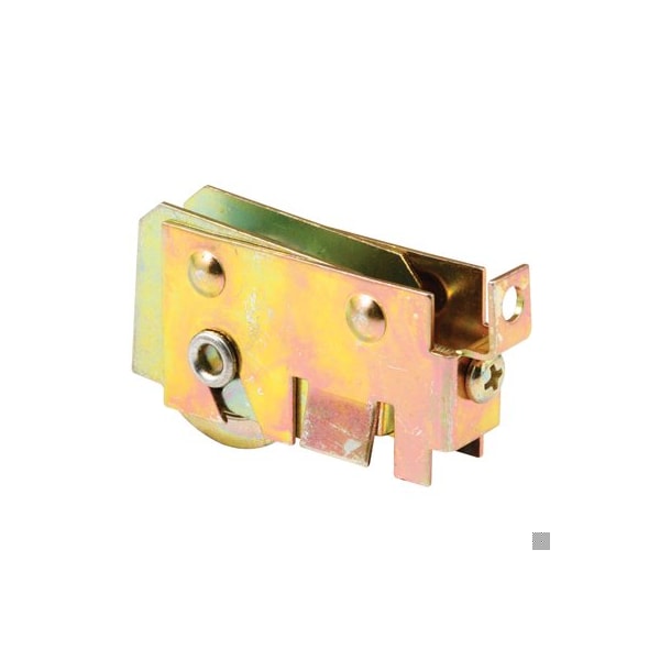 This is a F-tab patio door roller assembly with a 1-1/4 inch concave or grooved steel ball bearing roller. When the corner screw passes through the F-tab the assembly is captured by the side stile and bottom rail as the screw draws the two sides together. The housing is 5/8 inch wide with a 3/4 inch flare, 1-3/16 inch tall with a rear adjusting screw. Used by Rylock and a variety of other patio door manufacturers.