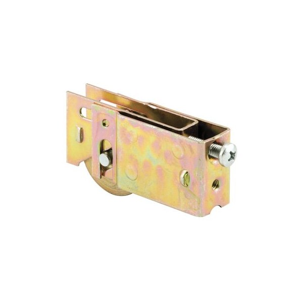 This is a plain back patio door roller assembly with a 1-1/4 inch concave or grooved steel ball bearing roller. It has a plain back housing that is 23/32 inch wide with a 3/4 inch dimple width and 1-3/16 inch tall. It is rear adjusting with a threaded mounting hole on the back end. It is used by Bee Cee, Harcar and a variety of other manufacturers of patio doors.