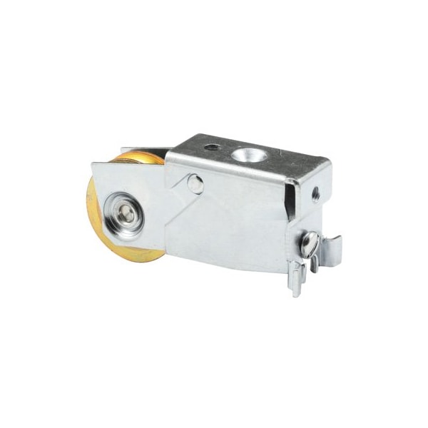 This is a unique back patio door roller assembly with a 1-1/4 inch concave steel ball bearing roller. It's has a tab design on the bottom back edge that snaps the roller assembly into place on the door stile edge before being held in place by a mounting screw in the 1/4-20 threaded mounting hole in the back end of the housing. It is 1-3/16 inch wide and 1-5/16 inch tall with an optional use #10-32 threaded hole in the top of the housing. Used by Smith and Kelly and a variety of other manufacturers.