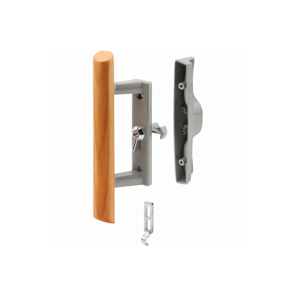 31516 sliding patio door handle with wood handle Can be used on either right or left handed doors The handle body is diecast steel with a wood handle attached Included is a matching outside handle and keeper The mounting holes are 31516 apart When the latch is installed into the door frame through an inside access hole, the connected lever is held in place by a flat spring as it operates the latch up and down to engage the keeper Carded